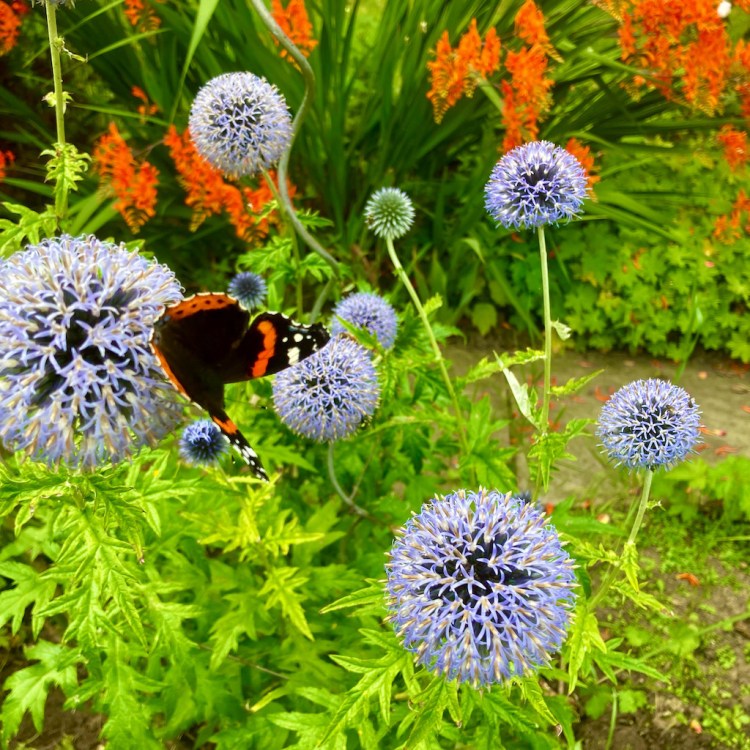 Not a hot summer, but still plenty of butterflies – this Red Admiral is enjoying the globe thistles