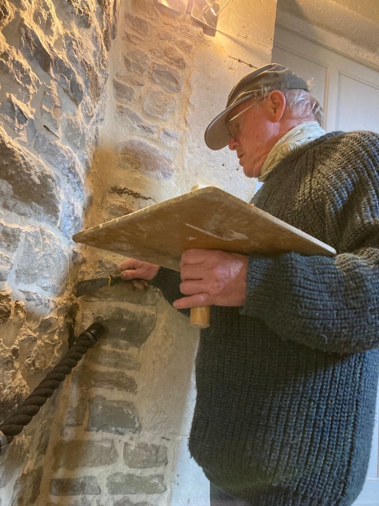 Nigel putting the finishing touches to the rope banister on the stone spiral staircase