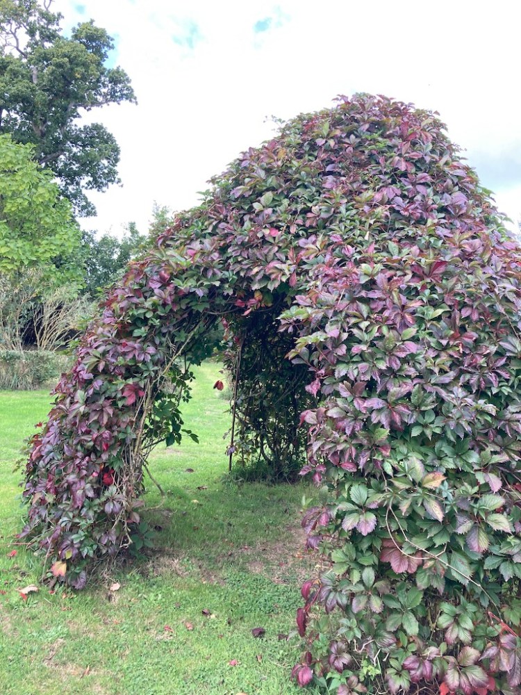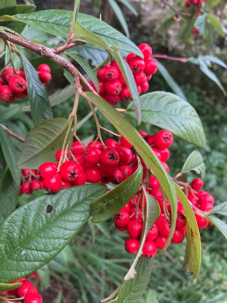 A bright leaf of Liquidambar Worplesdon looking like a jewelled brooch on the grassThe glowing berries of Cotoneaster cornubiaThe Virginia creeper starting to show its autumn finery on the pagodaThe crab apple espalier looking a delight in autumn with its bright fruits so beloved by the birds