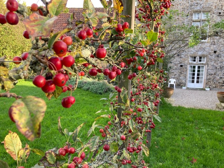 We were able to get back to Le Hot twice more during 2021, at the end of October for 12 days and at the end of November for a week. There had been a big storm here on October 20th, but the garden hadn’t suffered too much damage beyond a few branches down, two pergola poles snapped off, and a large Callicarpa stem broken in the Cottage Garden. Nigel put up guttering on the log store as well as water barrel. I dug out as many nettle-roots as I could find in the copse-clearing, and found that two of the ‘crab-apple’ trees planted there were laden with delicious eating apples!