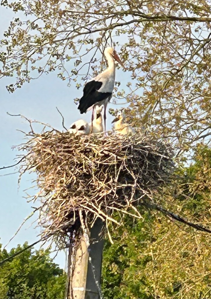 We were thrilled to find that, for the first time ever, the storks in our garden had managed to raise three strong chicks in their enormous nest on the telegraph pole. Very sadly, there was a really wild storm a fortnight after we arrived, and it blew one of the storklings out of the nest – it must have been taken quickly by a fox, being unable to fly at that point. The remaining two look happy and strong – and the nest looks very crowded, especially when the parents fly in with food for them!